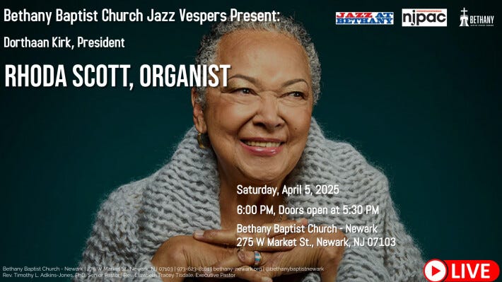 The star of next month’s Jazz Vespers at Bethany Baptist is the legendary Rhoda Scott!